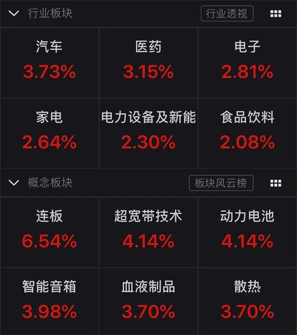 盘面上,申万行业指数全线飘红;概念中,黄金、华为、新能源车、无线耳机、酿酒等概念指数涨幅居前。