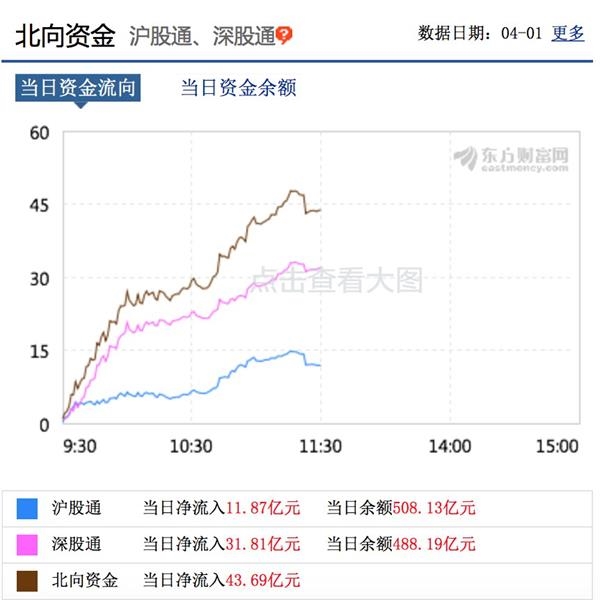 北向资金延续昨日净流入态势。据东方财富数据,截至A股午间收盘,北向资金半日合计净流入超43亿元,其中沪股通净流入11.87亿元,深股通净流入31.81亿元。
