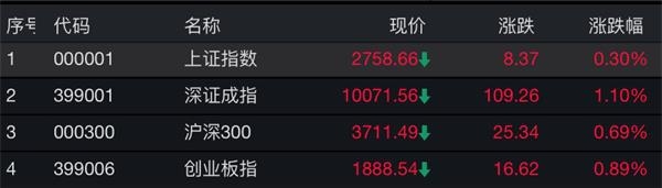 截至4月1日午间收盘,上证指数上涨0.30%,报2758.66点;深证成指上涨1.10%,报10071.56点;创业板指上涨0.89%,报1888.54点。两市有所放量,沪市半日成交额为1376.28亿元,深市半日成交额为2228.59亿元。