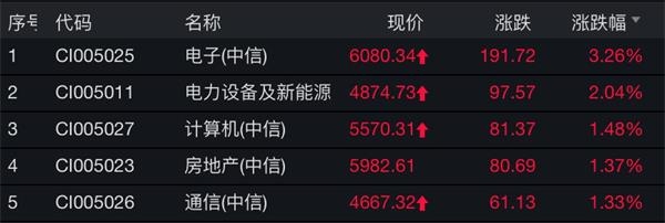 数据显示,截至午间收盘,电子板块涨3.26%,领涨中信一级行业板块;板块内华天科技、天华超净、通富微电、艾比森涨停。计算机、通信板块涨幅均靠前。