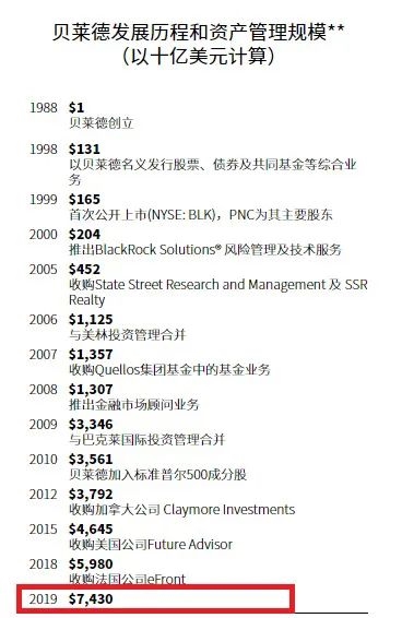 作为全球最大的资产管理集团,截至2019年12月31日,贝莱德在全球管理的总资产达7.43万亿美元,涵括股票、固定收益投资、现金管理、替代性投资、不动产及咨询策略。