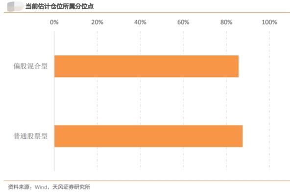 从历史对比来看,上周末普通股票型基金和偏股混合型基金的最新仓位水平,处于2016年以来仓位估计值序列中的87.6%和85.7%分位(即按照仓位由低至高的一至十档中,目前普通股票型基金和偏股混合型基金的最新仓位水平,均处于2016年至今的第九档)。