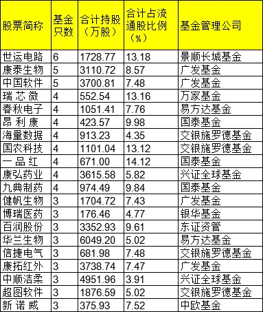 (注:由于指数型基金系被动配置,一些“独门股”的参考价值不高,在此仅统计只有一家基金公司的公募基金产品进入流通股股东前十,且进入名单的基金产品至少2只的情况。)