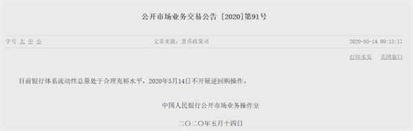 14日早间,央行公告称,目前银行体系流动性总量处于合理充裕水平,2020年5月14日不开展逆回购操作。全文没有提到中期借贷便利(MLF),数据显示,今日有2000亿元MLF到期。