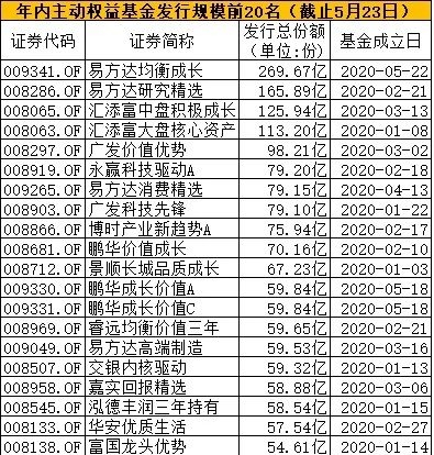 数据显示,截至5月23日,今年以来成立新基金达到512只,合计发行份额为7390.4亿份,其中包括股票型基金、混合型基金在内的权益基金合计大约发行308只,合计规模达到5131.28亿元,平均规模超16.6亿元。