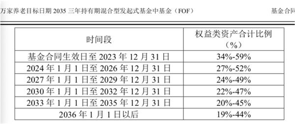 万家养老2035三年持有期混合(FOF)的投资范围则为权益类资产占比不超过基金资产的60%。其中,商品基金投资比例不超过10%;货币基金的投资比例不超过15%,并根据时间段降低权益资产比例。