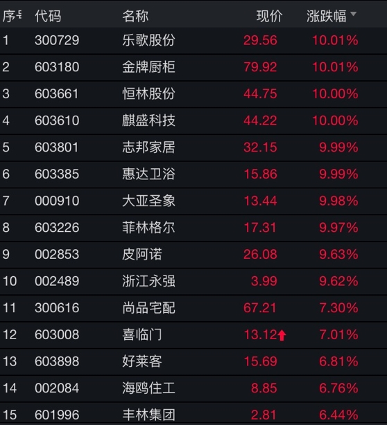 板块内多只个股涨停。截至午间收盘,乐歌股份、金牌厨柜、恒林股份、麒盛科技、志邦家居、惠达卫浴、大亚圣象、菲林格尔8只个股涨停;皮阿诺盘中触及涨停,浙江永强冲击涨停。