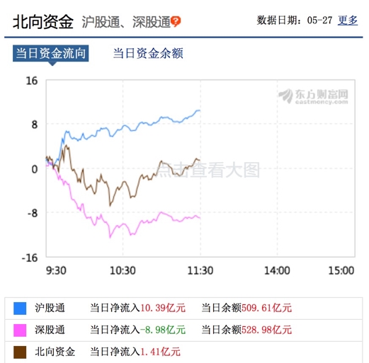北向资金27日早盘流向出现分化。据东方财富数据,截至午间收盘,沪股通净流入10.39亿元,深股通净流出8.98亿元,半日合计净流入1.41亿元。