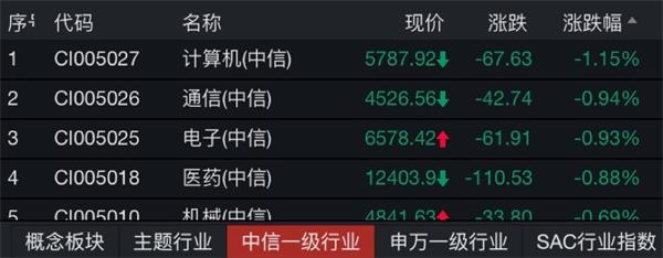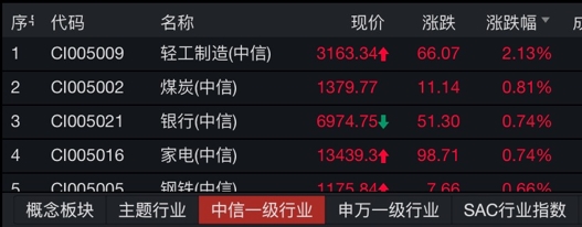 中信一级行业板块午间收盘时涨跌互现。其中,轻工制造板块表现亮眼,午间收盘大涨2.13%,稳居涨幅榜榜首。