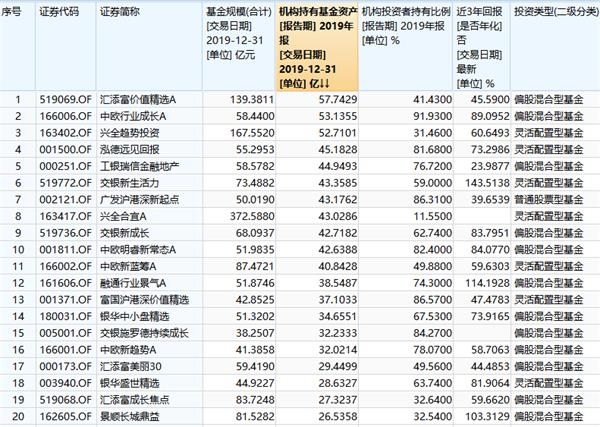 下图为主动偏股型基金中,截至2019年末,机构持有基金资产最多的20只产品,其中剔除了战略配售基金及部分单一持有人份额占比过高的基金。