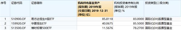 另外,在部分跨境ETF中,机构参与程度也较高,可以看到,易方达恒生H股ETF、华夏恒生ETF与博时标普500ETF的机构投资者持有比例均在80%左右,其中易方达恒生H股ETF获机构持有85.81亿元。