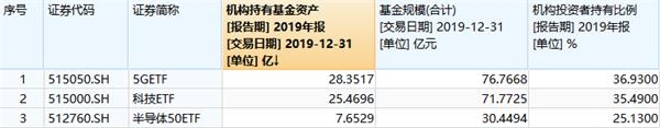 以今年初较为火爆的几只科技主题ETF为例,截至2019年末,华夏中证5G通信主题ETF,机构持有基金28.35亿元,持有比例36.93%;华宝中证科技龙头ETF,机构持有基金25.47亿元,持有比例35.49%;国泰CES半导体ETF,机构持有基金7.65亿元,持有比例25.13%。