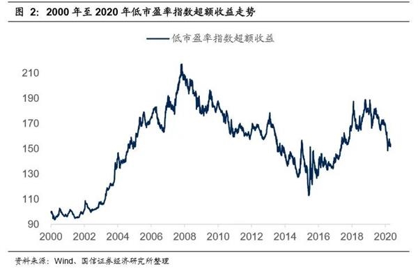国金证券数据显示,低市盈率策略的有效性(指跑赢市场整体的超额收益)有着很强的趋势性变化特征:大体上从2003年开始到2007年,低估值策略明显跑赢市场整体;从2008年到2015年左右,低估值策略明显跑输大盘;从2015年到2018年底,低市盈率策略再度显著跑赢市场整体;最后从2018年底左右至今,低市盈率组合又显著跑输大盘。