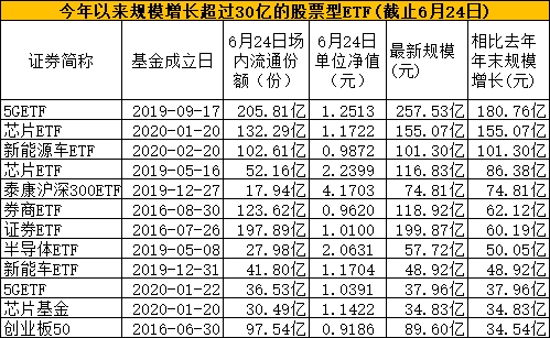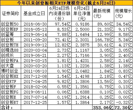 除此之外,其他创业板相关ETF中,南方创业板ETF、华夏创蓝筹ETF今年规模增长均接近10亿元,截止6月24日,所有16只创业板相关ETF合计规模353.06亿元,年内吸金72.30亿元。