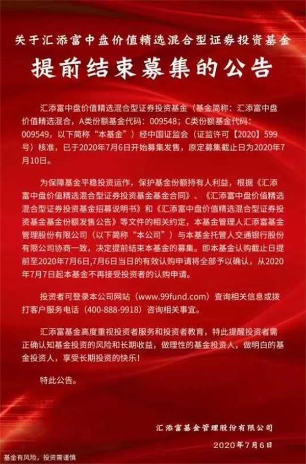 7月6日,汇添富中盘价值精选发行仅半天,募资金额接近700亿元,发行中途,汇添富基金临时公告直销中心、网上直销系统、代销机构停止销售。