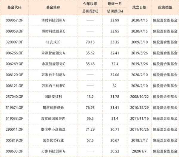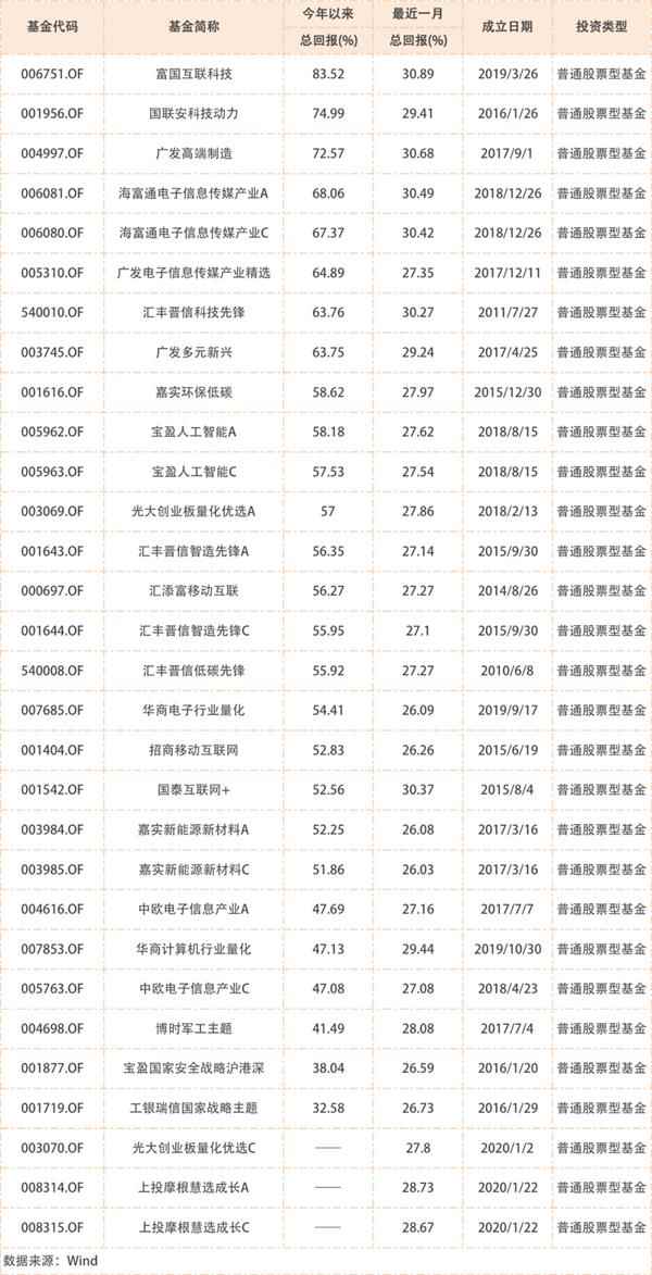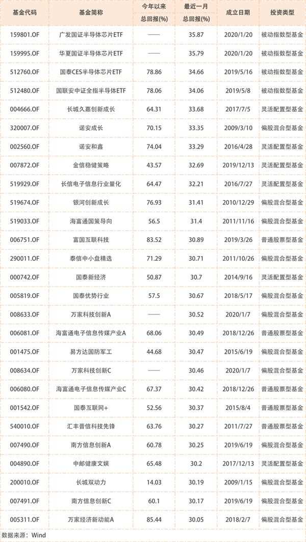 2、再来看,半导体、电子元器件、通信设备、软件等行业主题基金,近一个月多达99只基金的净值涨幅超过了创业板指数,其中业绩回报超过30%的基金如下: