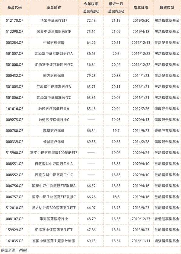 3、这波行情也少不了医药相关的主题,6月13日~7月12日,中证医药指数涨幅为18.53%,选取基金名称中带有“医”字的基金,涨幅超过医药指数的基金如下: