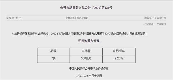 7月14日,央行再度在公开市场开展300亿元7天期逆回购操作,今日无逆回购到期。
