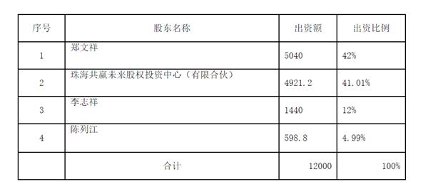 尚正基金由三位自然人发起设立。其中郑文祥出资5040万元,出资比例42%,为公司第一大股东;作为员工持股平台的珠海共赢未来股权投资中心(有限合伙),出资4921.2万元,持股比例41.01%,为第二大股东;另外两名自然人,李志祥及陈列江分别出资1440万元、598.8万元,分列公司第三、第四大股东。