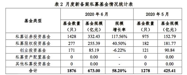 而在私募基金方面,6月份中基协新备案私募基金1876只,较上月增加598只,环比增长46.79%;新备案基金规模673亿元,较上月增加247.60亿元,环比增长58.20%。其中,私募证券投资基金1428只,占新备案基金数量的76.12%,新备案规模332.43亿元,环比增长117.56%。
