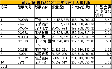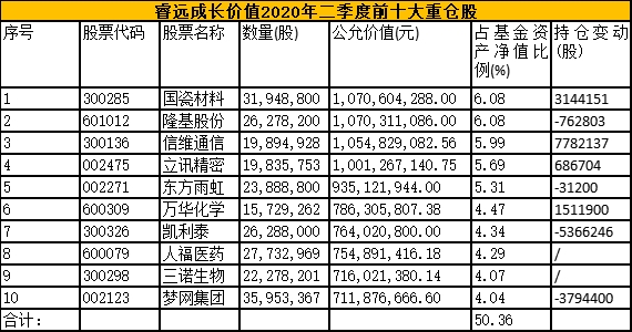 上述前十大重仓股占睿远成长价值的基金资产净值比例为50.36%,与上一季度基本持平。