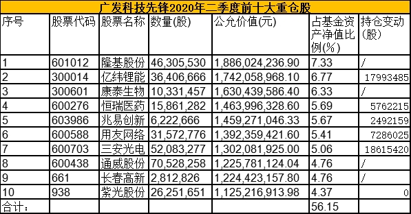 从广发科技先锋二季度前十大重仓股上看,隆基股份、康泰生物、通威股份、长春高新4只个股新进其前十大重仓股,此外,亿纬锂能、恒瑞医药、兆易创新等个股获得不同程度增持。前十大重仓股合计占基金资产净值比例56.15%,相比上一季度提升了2.03个百分点。