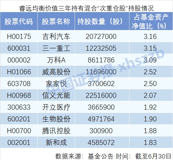 赵枫管理的睿远均衡价值三年持有混合的“次重仓股”则比较多样。