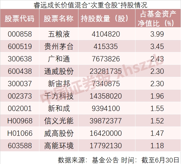 傅鹏博管理的睿远成长价值混合二季度末的“次重仓股”如下表。可以看到,傅鹏博的“次重仓股”中,白酒股也是重要的配置。