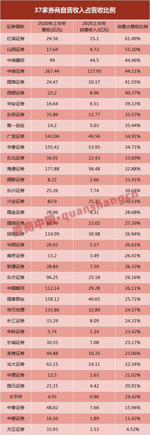 从自营收入占营收的比例来看,有16家券商自营收入占比超过30%,其中红塔证券、山西证券分别取得15.10亿元和9.72亿元的自营收入,占上半年营收的比例分别为61.49%和55.10%;中信建投、中信证券、国海证券、西部证券的自营占比超过40%。