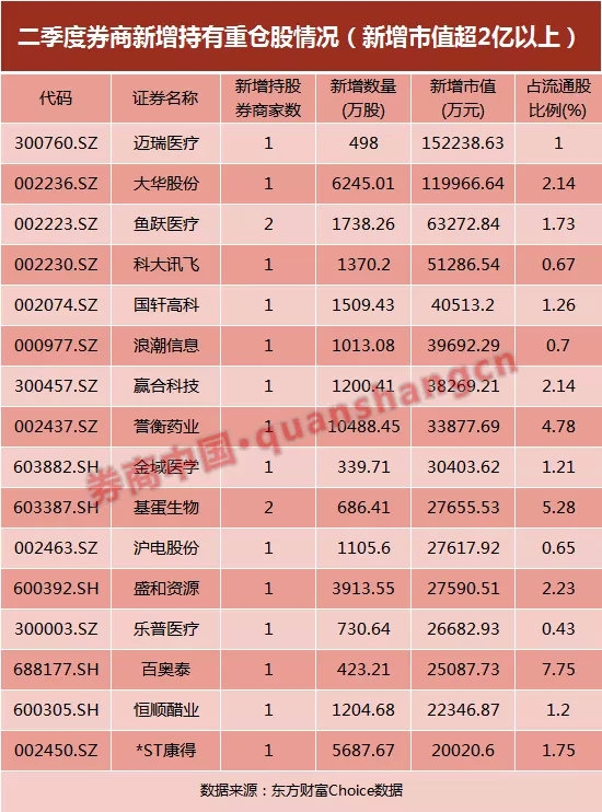 光峰科技、热景生物、兆丰股份、松井股份、天合光能、甘李药业、燕麦科技、常山药业、鱼跃医疗等个股均为2家券商新增个股。其中,兴业证券和中信证券在二季度新增松井股份,合计持股比例达到4.59%,至二季度末,这个新股的涨幅超过200%;兴业证券和国元证券二季度新增基蛋生物,合计持股比例为5.28%,其中兴业证券持股比为4.06%,二季度内,这只个股的整体涨幅超过28%。