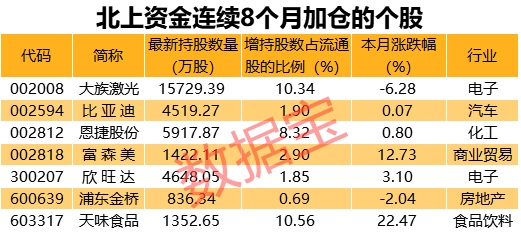 将时间拉长,5股被北上资金连续8个月加仓。从持股比例变动情况来看,天味食品获加仓幅度最大,相比八个月前持股比例增加了10.56个百分点;其他加仓较多的还有大族激光、恩捷股份等。