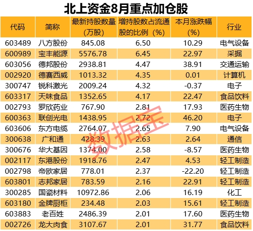 从加仓幅度比例来看,8月北上资金加仓股共700只,增持股份占流通股比例超1%的有71只。具体来看,八方股份的加仓幅度最为明显,北上资金最新持有845.08万股,增持股占流通股比例为6.5%;紧随其后是宝丰能源,增持股占流通股比例为6.45%;其他加仓比例靠前的还有德邦股份、德赛西威、锐科激光、罗欣药业等。