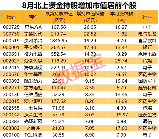 从北上资金持股市值增加值来看,8月份25股获得重点加仓,北上资金持股市值都增加了5亿元以上。其中,京东方A、宁德时代分别增加了26.05亿元、22.52亿元位列前二。