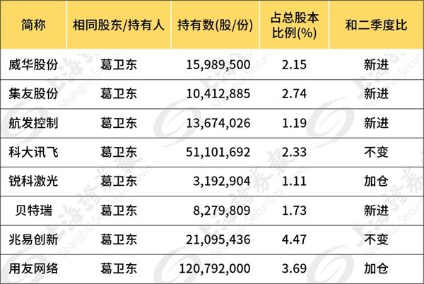 从整体来看,据上市公司2020年三季报,葛卫东现身威华股份、集友股份、航发控制、科大讯飞、锐科激光、贝特瑞、兆易创新、用友网络等8家上市公司的前十大流通股东名单中。除了集友股份、航发控制外,其余均属于科技板块。