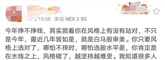 对此,有股民表示,“今年挣不挣钱,其实就看你在风格上有没有站对,不只是今年,最近几年皆如是,就是白马股审美。你只要风格上选对了,哪怕不择时,哪怕选股水平差,你肯定是在水线之上,风格错了,越坚持越难受。”