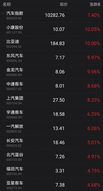 从指数上来看,今天,汽车指数大涨超7.4%。