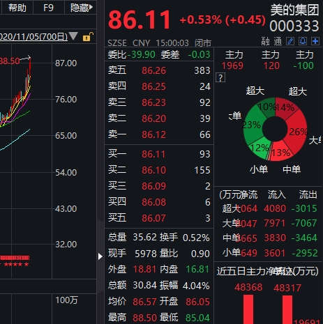 美的集团也在近日连日暴涨,盘中突破88.5元每股,股价盘中创历史新高。