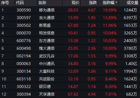 A股方面,中兴通讯、移为通信、烽火通信、特发信息等纷纷涨停,吉大通信涨13.89%,烽火通信涨8.9%,欣天科技、星网锐捷等跟涨 。