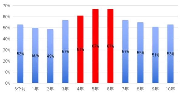 数据显示,持有半年到两年,获得超过10%年化收益率的比例相对较低,但持有时间在4至6年的时候,年化收益率超10%的概率是最高的,最高可达到67%;如果再拉长持有时间,坚持持有7至10年,这个概率又会下降,跟短期持有的获胜概率差不多。