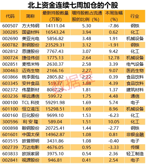 将时间拉长,22股被北上资金连续七周加仓。从持股比例变动情况来看,方大特钢获加仓幅度最大,较七周前增持股数占流通股的比例5.3%;其他连续加仓的还有国瓷材料、美亚光电、新钢股份等。