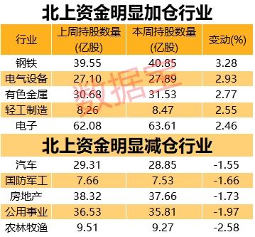 本周,顺周期股继续成为北上资金追捧的香饽饽,钢铁、有色金属的加仓幅度位居前三,金融股则褪去热度。