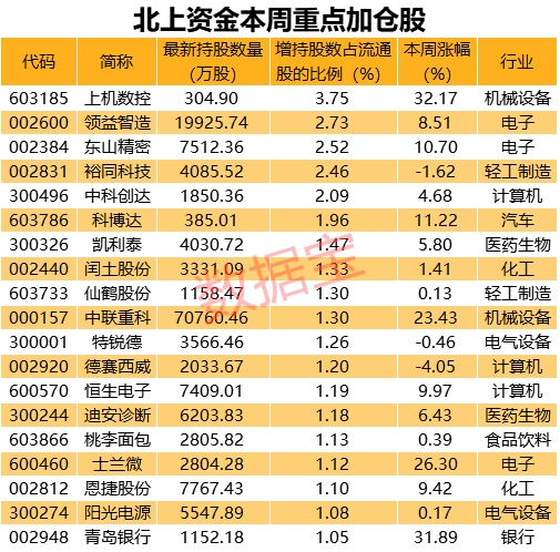 本周北上资金加仓股共753只,以增持股占流通股比例来看,加仓幅度超0.5%的有68只。上机数控加仓比例最大,最新持股数为304.9万股,增持股数量占流通股比例为3.75%;紧随其后是领益智造,加仓幅度为2.73%;其他加仓幅度靠前的还有东山精密、裕同科技、中科创达、科博达等。