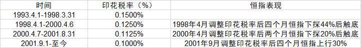 自1993年以来,香港股票交易印花税历次调整均为下调。其中,1998年4月调整后四个月,恒指下探44%后触底;2001年9月调整后四个月,恒指累计上涨30%。