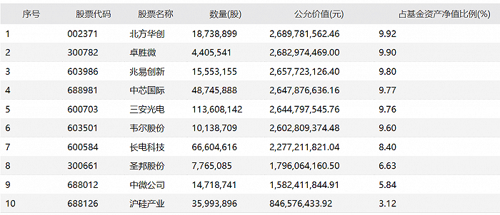 具体到前十大重仓个股,除了个股排名名次稍有变化外,并没有新进和新出的个股,这也证明了蔡嵩松对半导体行业爱得深沉。