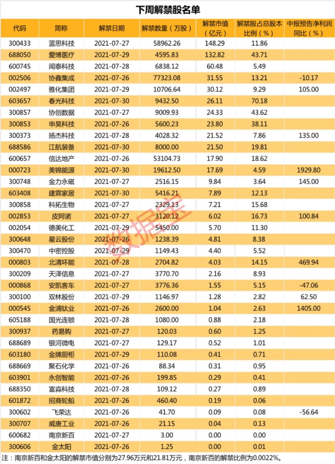 下周这些股面临解禁 2股解禁市值超100亿元(附名单)