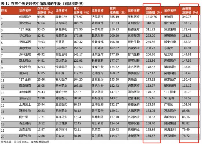 在不同的历史阶段,医药板块也相应涌现出了不同的牛股:当前后疫情时代,美迪西、佰仁医疗、热景生物、博腾股份、延安必康等均涨幅翻倍。