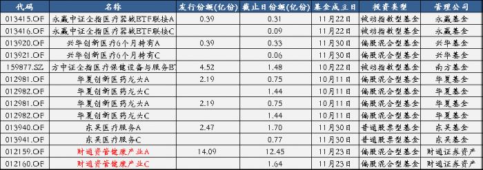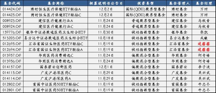 近1个月来密集新发医药基金。11月19号以来,共有15只医药基金发布招募说明书。