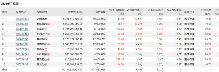 葛兰在三季度维持了高仓位的运作,在长期看好的创新药产业链、医疗服务、高质量仿制药的龙头企业等方向进行了着重布局。中欧医疗健康的前十大重仓股7只与赵蓓所管基金相同,但另外三只通策医疗、智飞生物和迈瑞医疗今年的收益率均为负,分别亏损13.34%、26.44%和11.68%。另外今年以来涨势较好的美迪西、博腾股份虽为前十大重仓股,但在基金净值中占比相对较低。