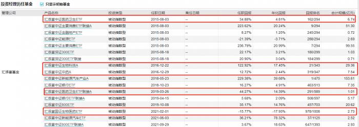 当前过蓓蓓旗下管理有消费、新能源、金融、医药等共计17只被动指数型基金,其中在管5只医药基金:汇添富中证医药卫生ETF、汇添富中证生物科技A、汇添富中证中药A、汇添富中证医药卫生ETF联接A、汇添富国证生物医药ETF,任职回报分别为34.88%、122.92%、12.72%、44.27%、-15.77%。