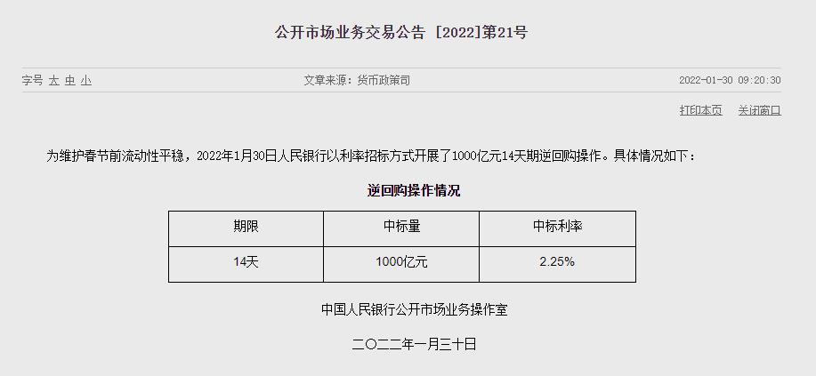 (原标题:央行今日开展1000亿元人民币14天期逆回购操作)
